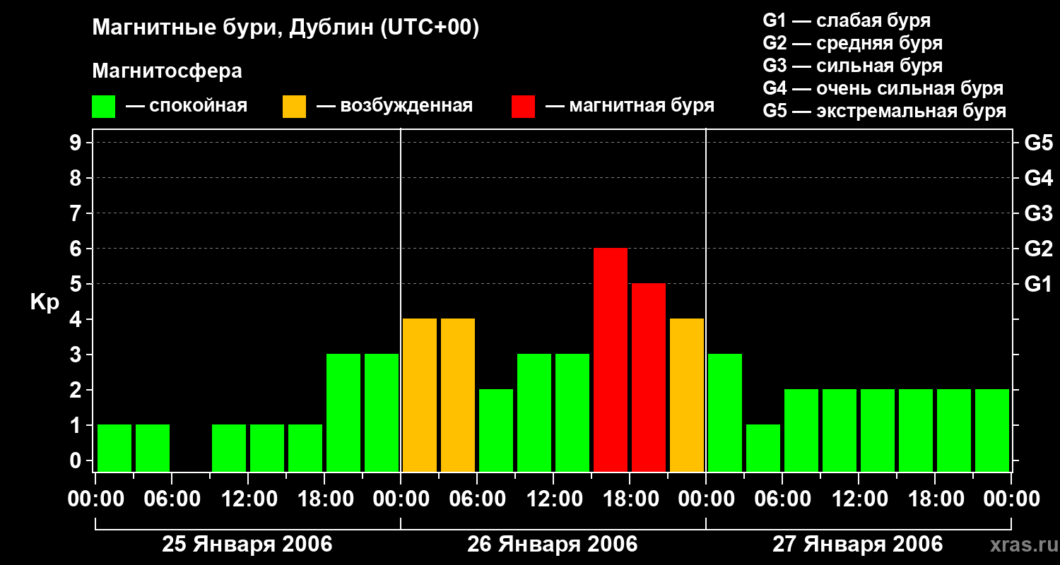 Изменения геомагнитного индекса Kp с 25 по 27 января 2006 года для средних широт