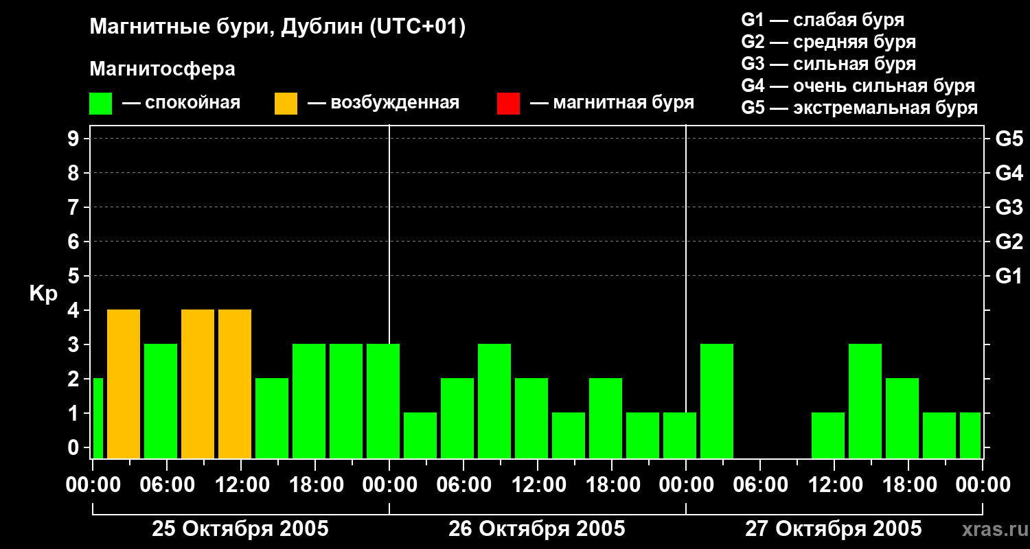Изменения геомагнитного индекса Kp с 25 по 27 октября 2005 года для средних широт