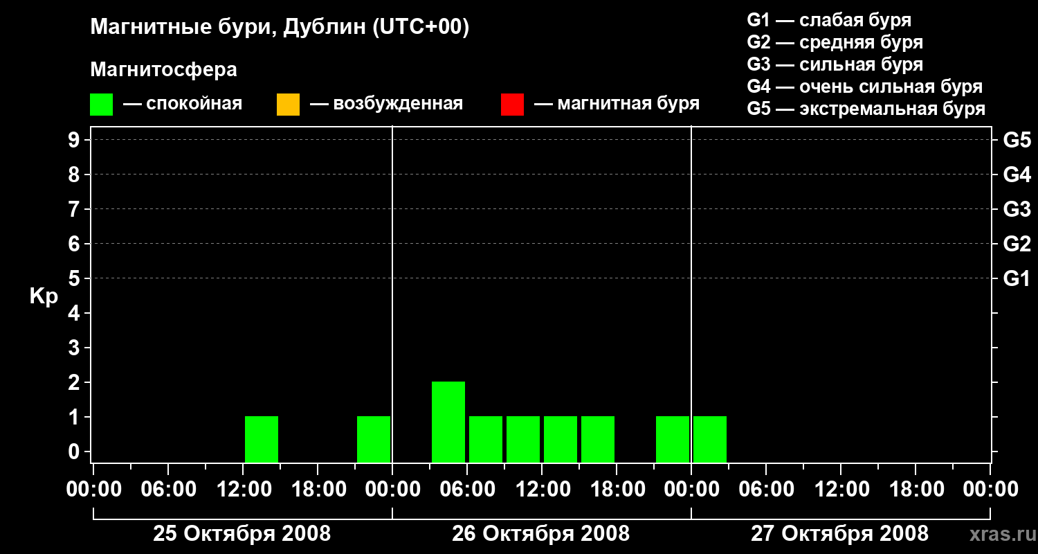 Изменения геомагнитного индекса Kp с 25 по 27 октября 2008 года для средних широт