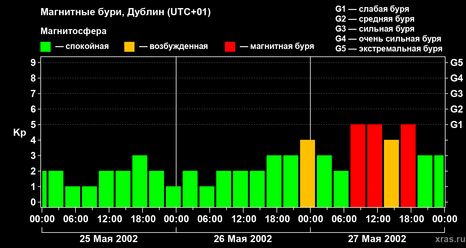 Изменения геомагнитного индекса Kp с 25 по 27 мая 2002 года для средних широт