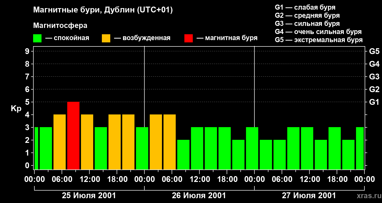 Изменения геомагнитного индекса Kp с 25 по 27 июля 2001 года для средних широт