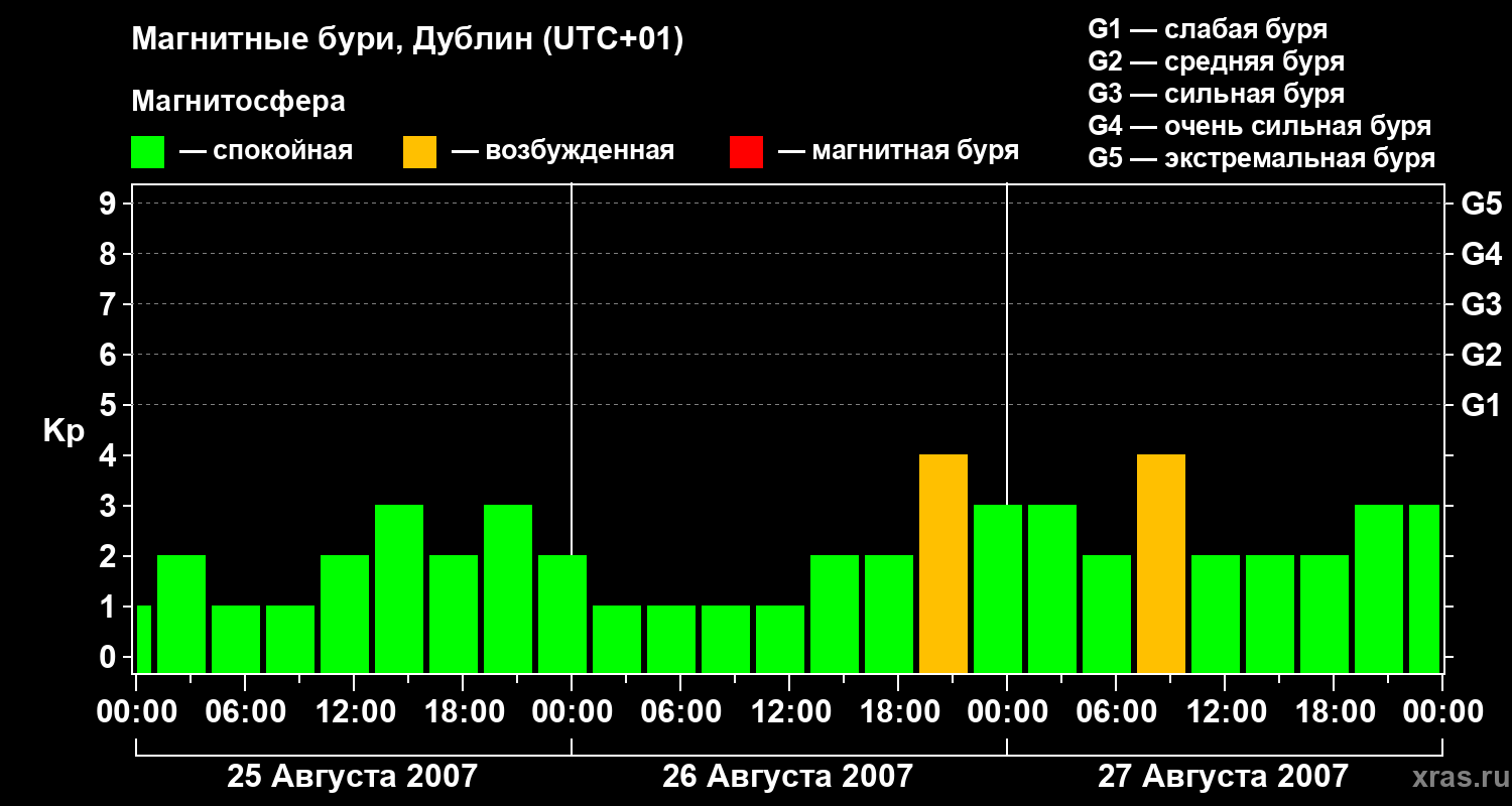 Изменения геомагнитного индекса Kp с 25 по 27 августа 2007 года для средних широт