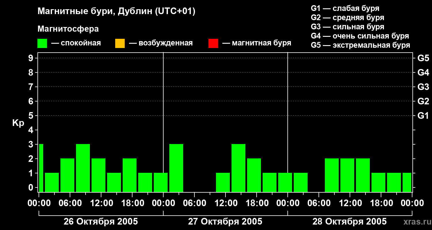 Изменения геомагнитного индекса Kp с 26 по 28 октября 2005 года для средних широт