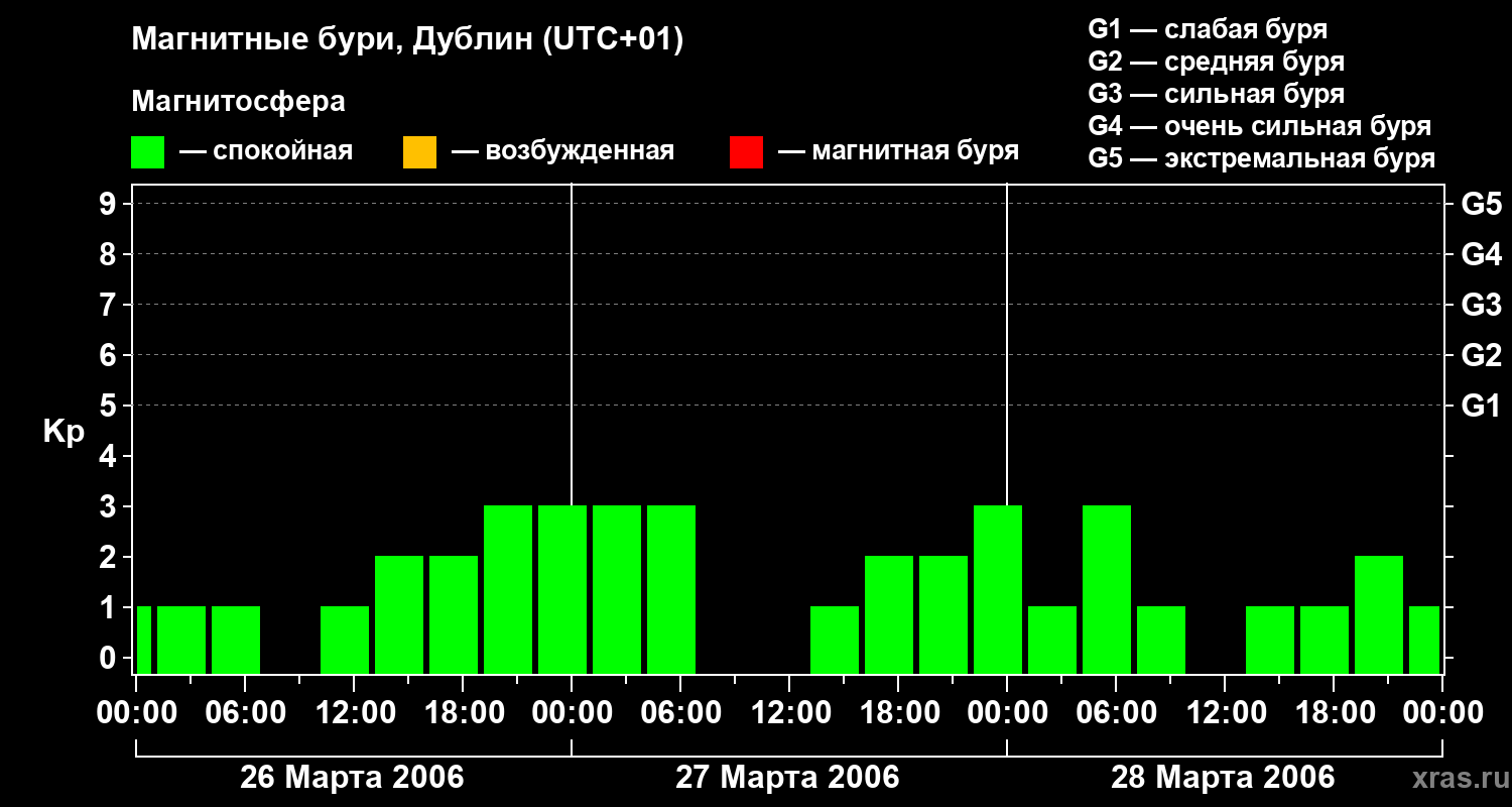 Изменения геомагнитного индекса Kp с 26 по 28 марта 2006 года для средних широт