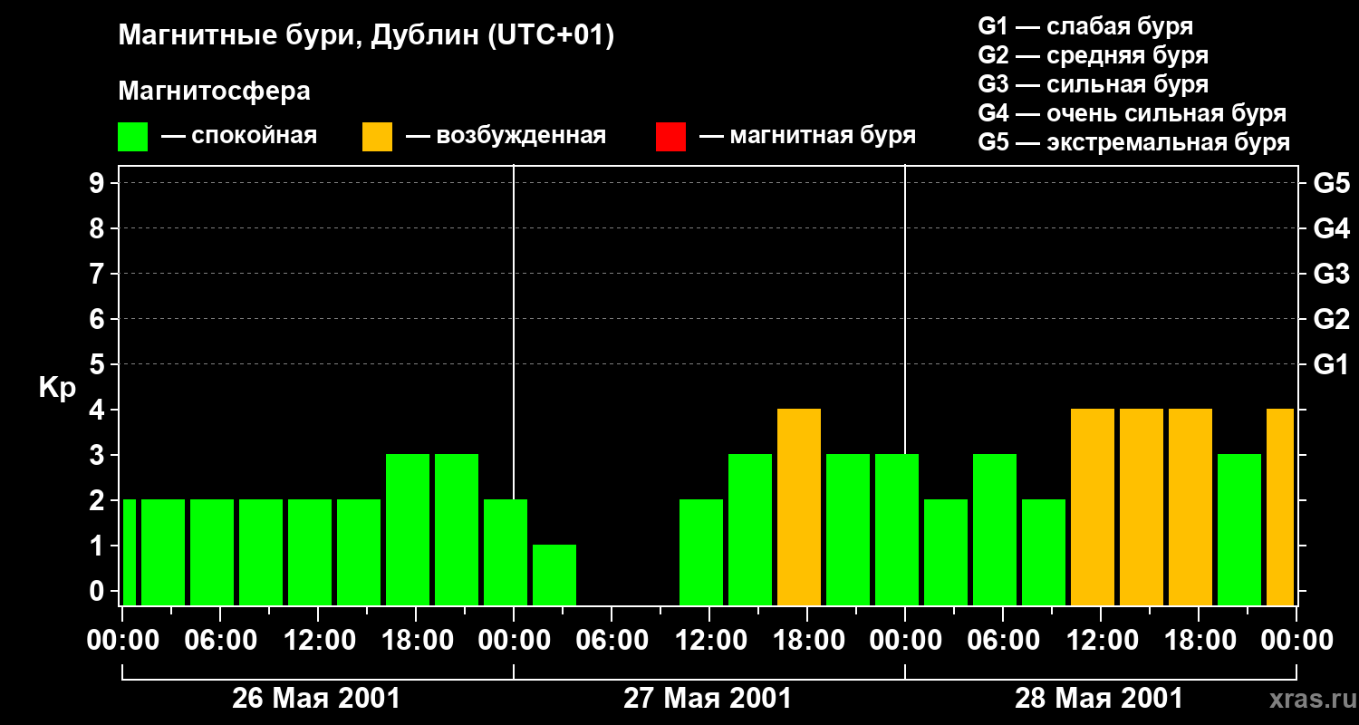 Изменения геомагнитного индекса Kp с 26 по 28 мая 2001 года для средних широт