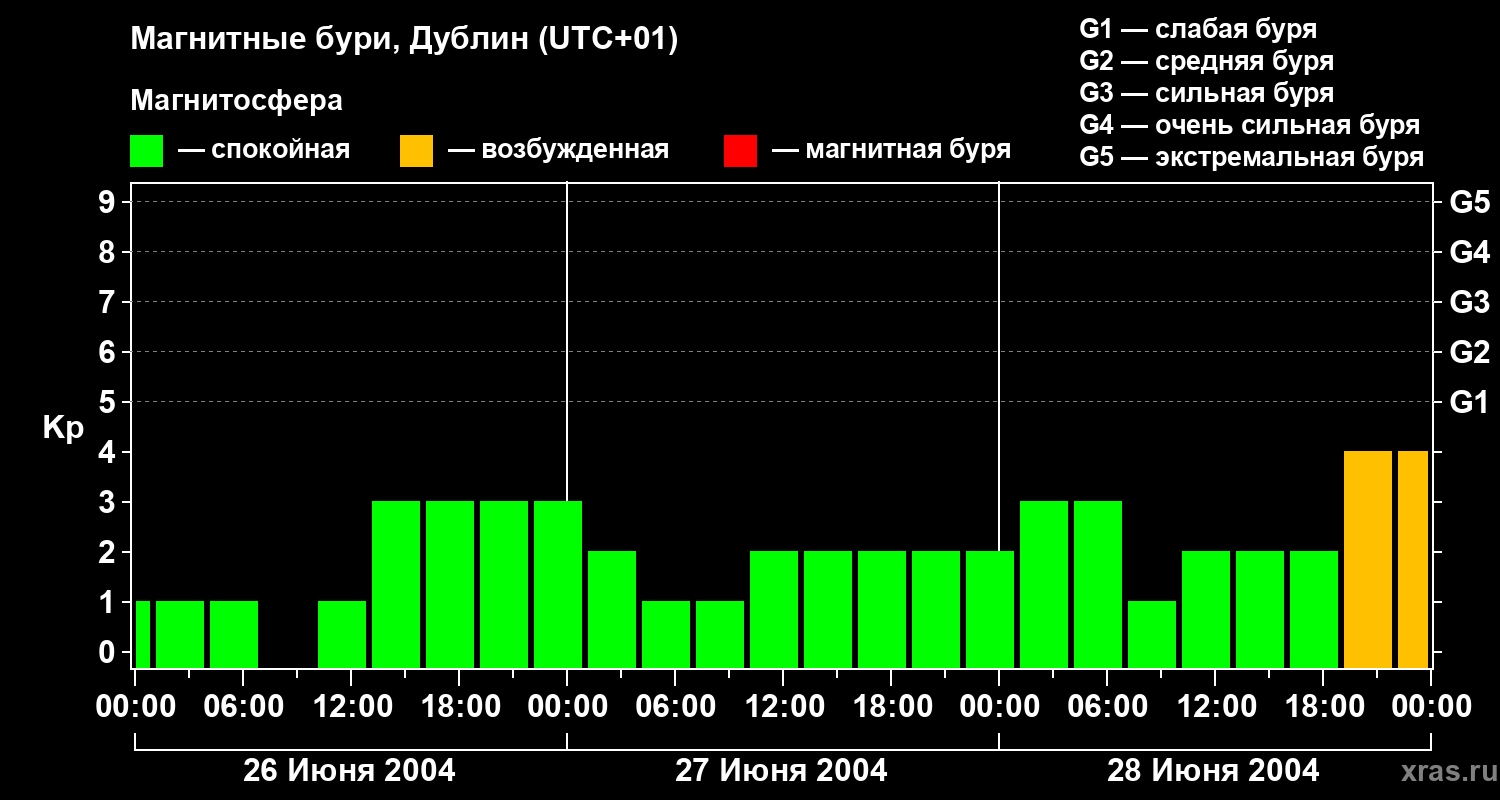 Изменения геомагнитного индекса Kp с 26 по 28 июня 2004 года для средних широт