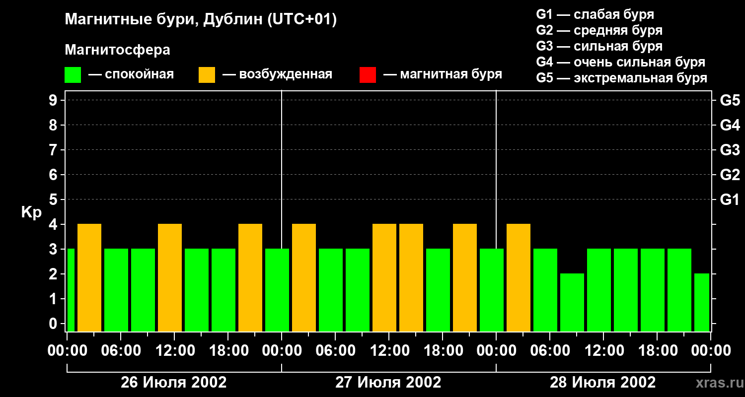 Изменения геомагнитного индекса Kp с 26 по 28 июля 2002 года для средних широт
