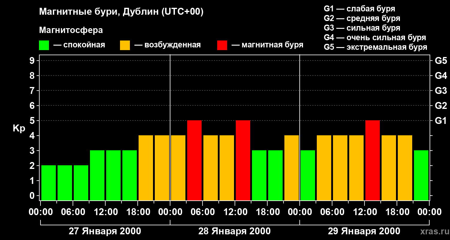 Изменения геомагнитного индекса Kp с 27 по 29 января 2000 года для средних широт