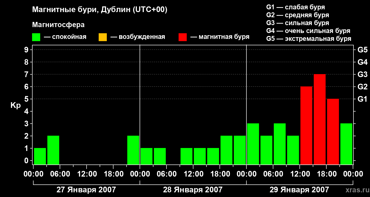 Изменения геомагнитного индекса Kp с 27 по 29 января 2007 года для средних широт