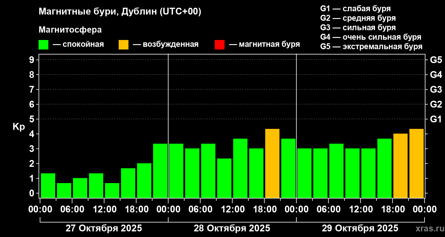 Изменения геомагнитного индекса Kp с 27 по 29 октября 2025 года для средних широт
