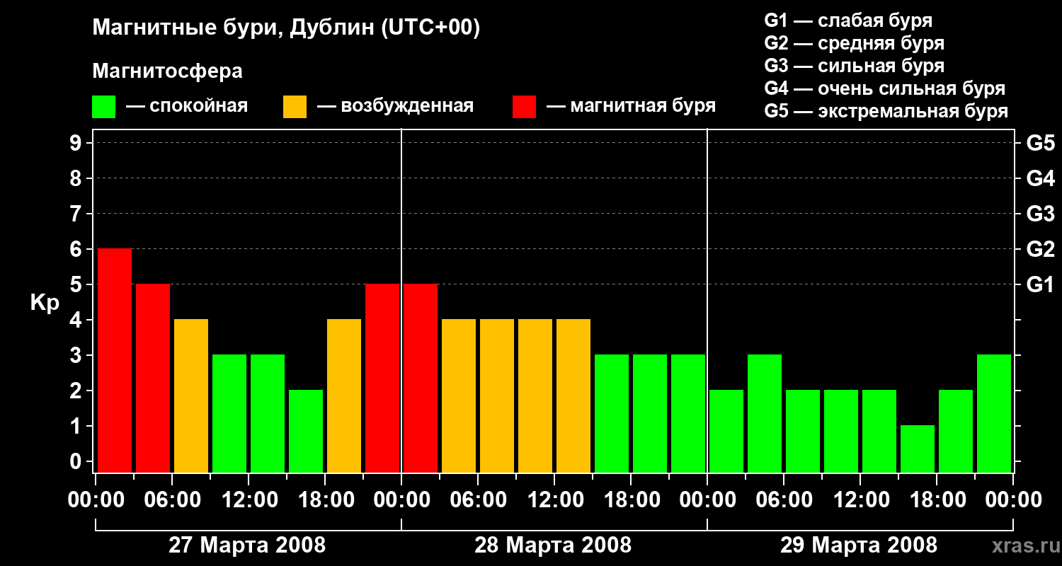 Изменения геомагнитного индекса Kp с 27 по 29 марта 2008 года для средних широт