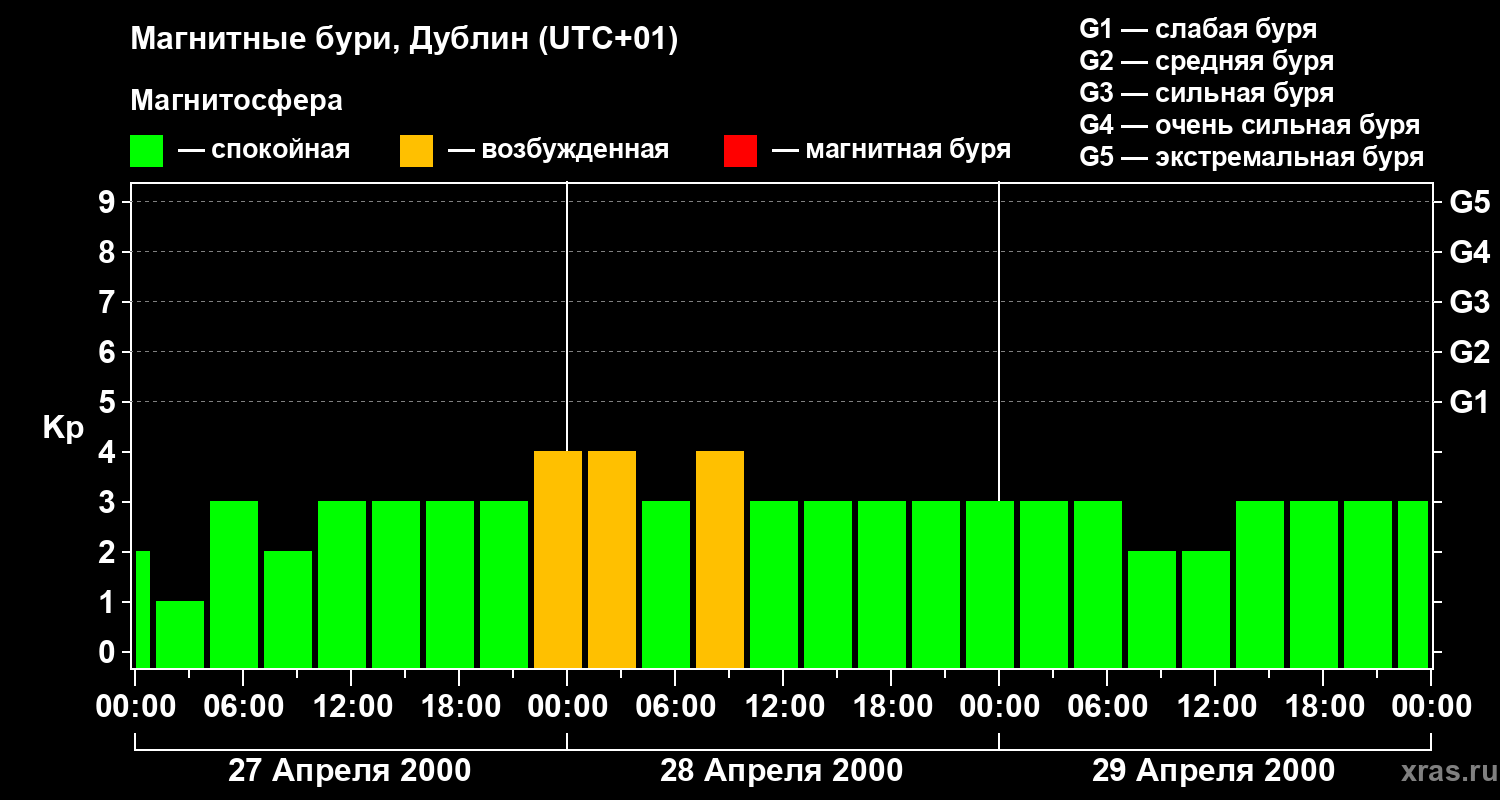 Изменения геомагнитного индекса Kp с 27 по 29 апреля 2000 года для средних широт