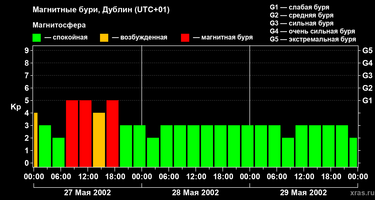 Изменения геомагнитного индекса Kp с 27 по 29 мая 2002 года для средних широт