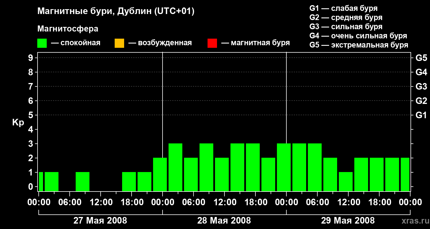 Изменения геомагнитного индекса Kp с 27 по 29 мая 2008 года для средних широт