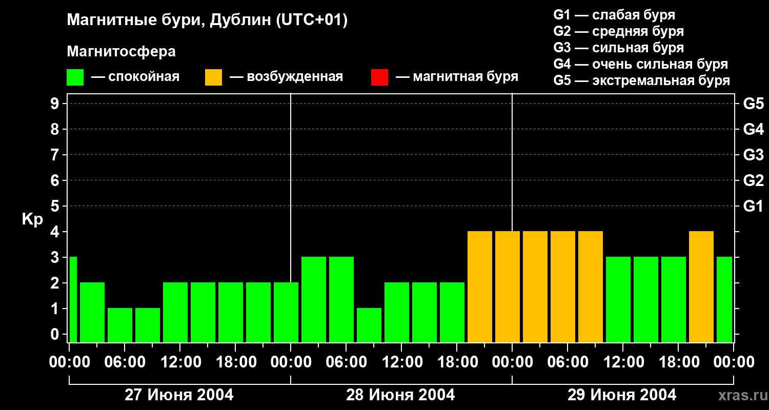 Изменения геомагнитного индекса Kp с 27 по 29 июня 2004 года для средних широт