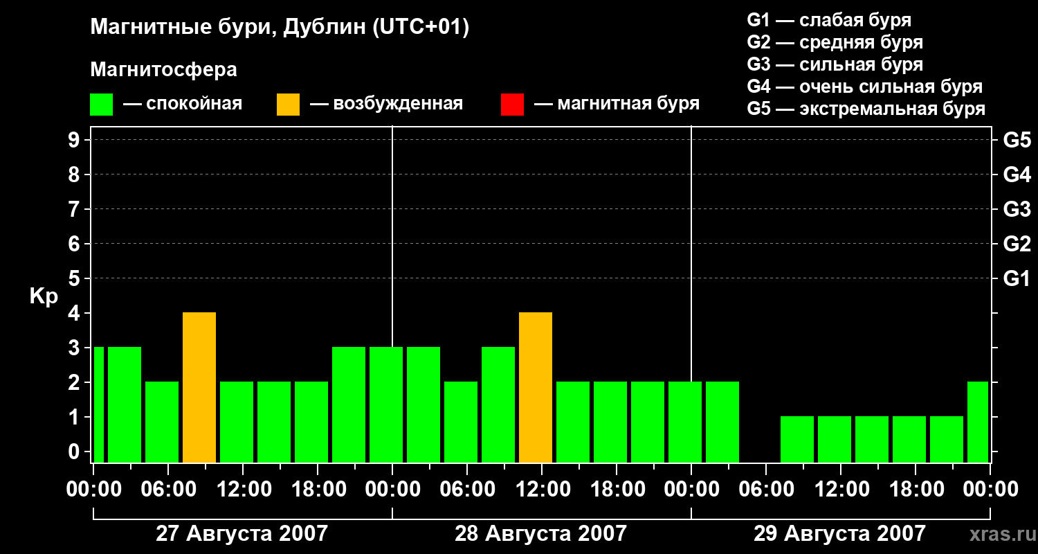 Изменения геомагнитного индекса Kp с 27 по 29 августа 2007 года для средних широт