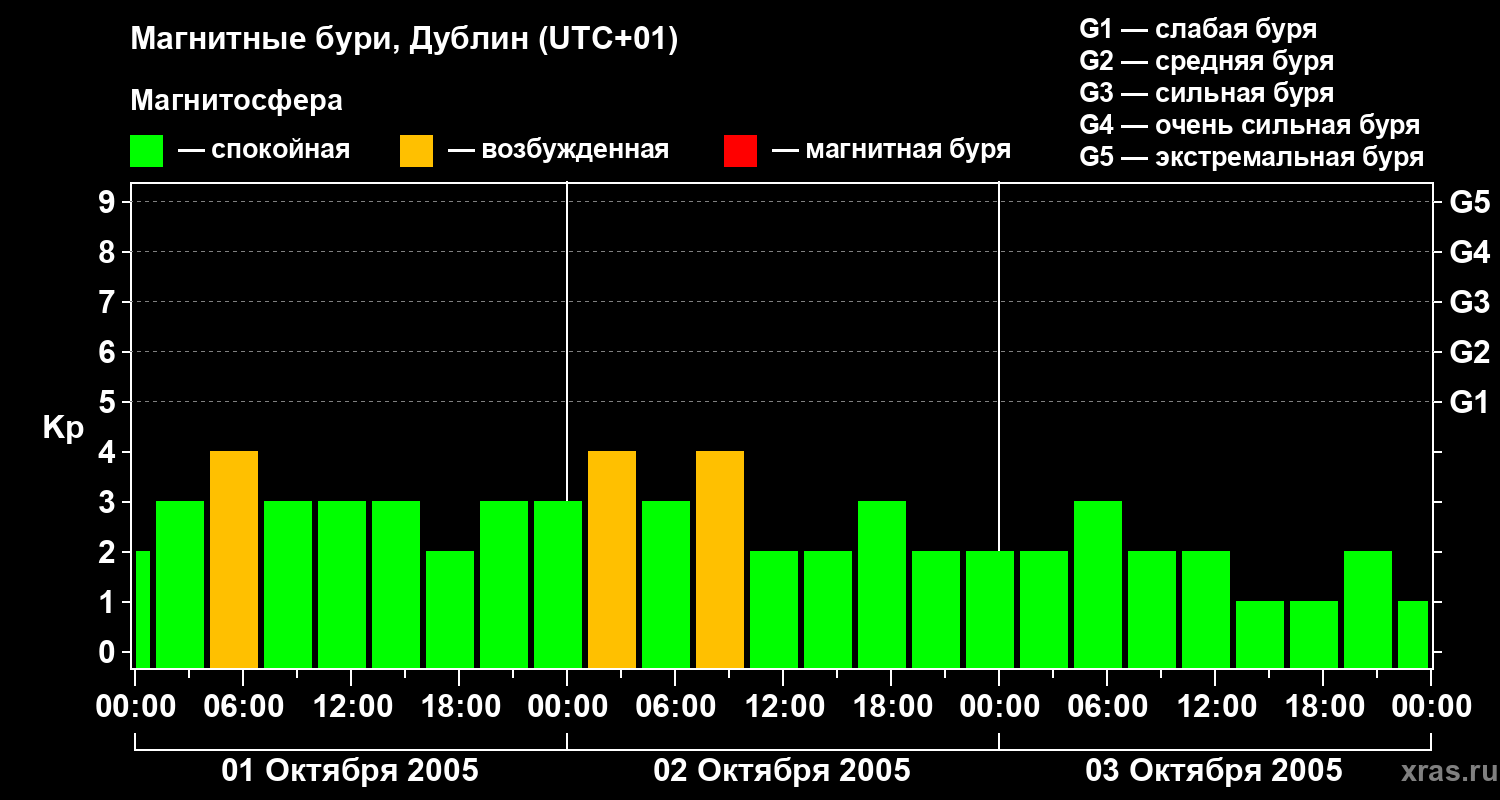 Изменения геомагнитного индекса Kp с 1 по 3 октября 2005 года для средних широт