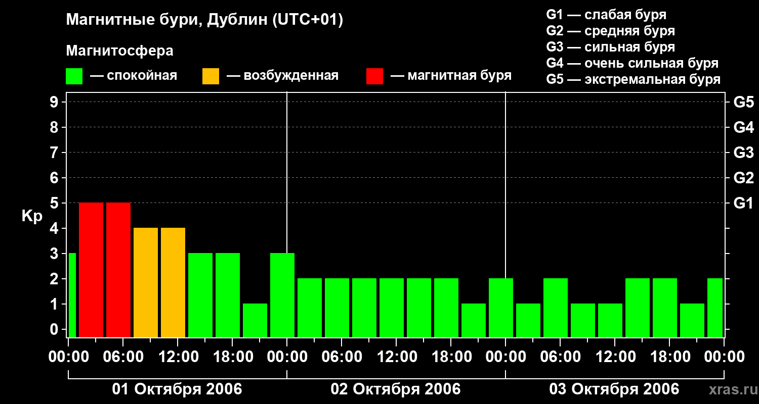 Изменения геомагнитного индекса Kp с 1 по 3 октября 2006 года для средних широт
