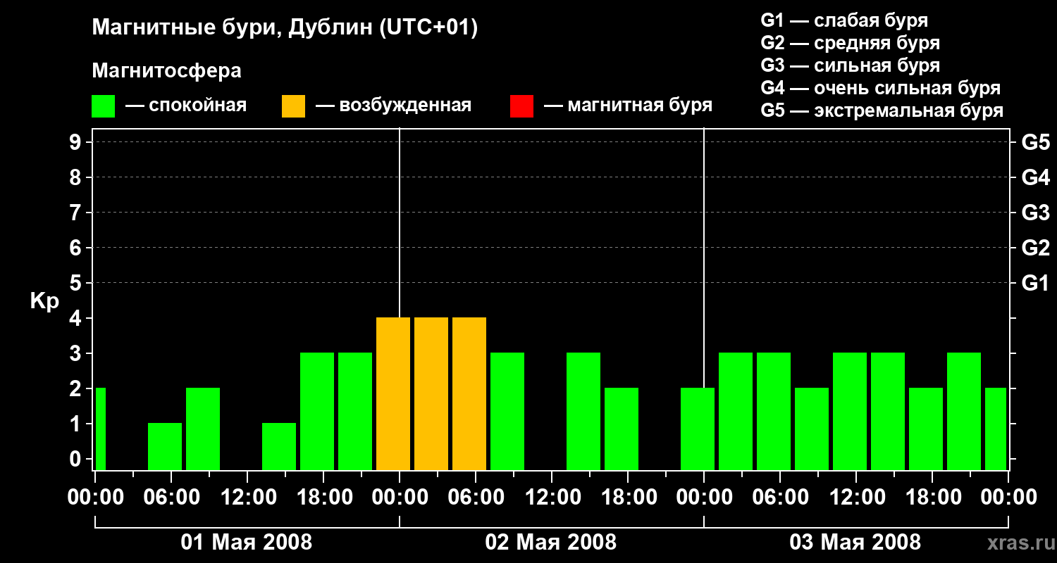 Изменения геомагнитного индекса Kp с 1 по 3 мая 2008 года для средних широт