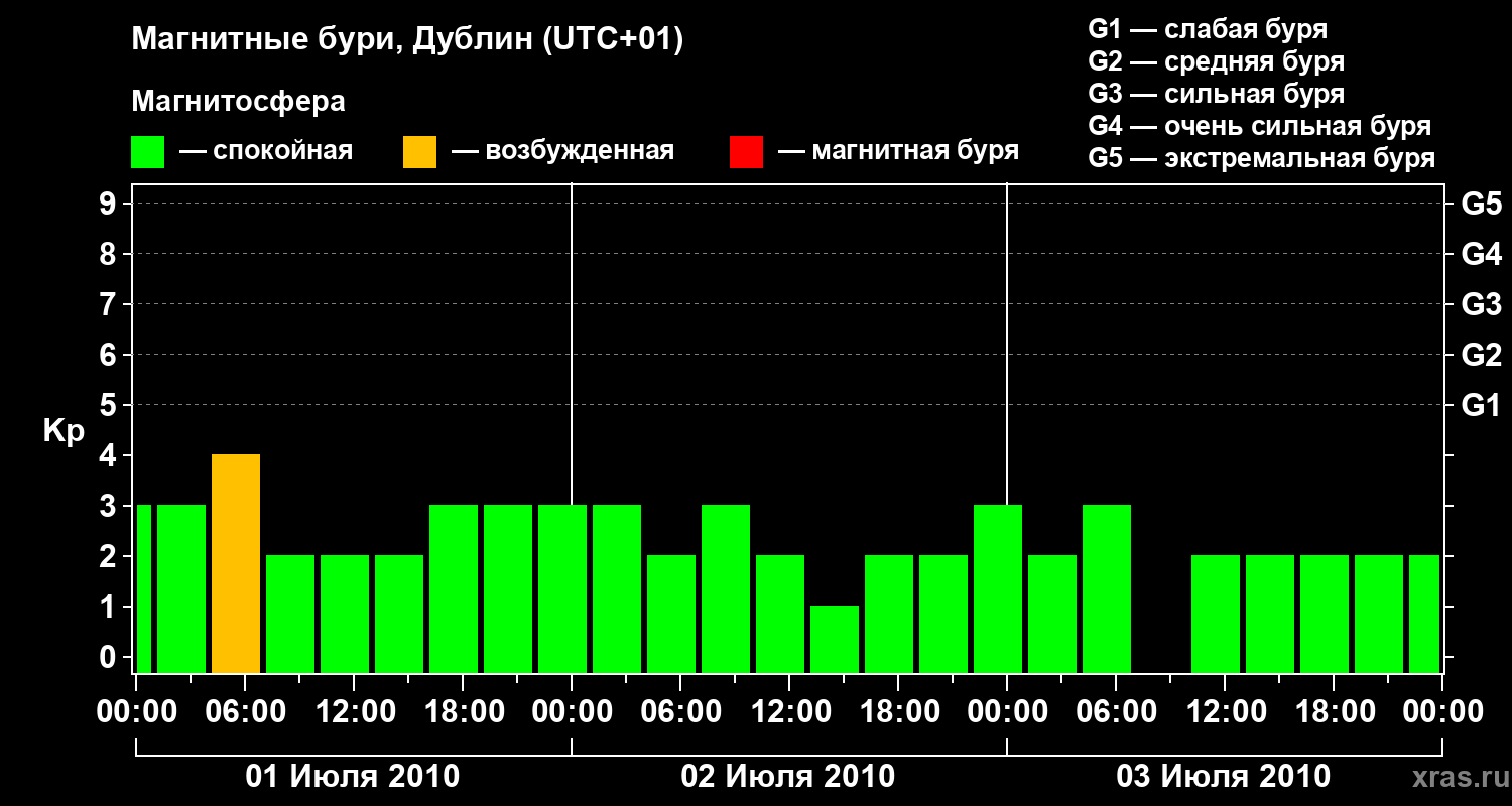 Изменения геомагнитного индекса Kp с 1 по 3 июля 2010 года для средних широт