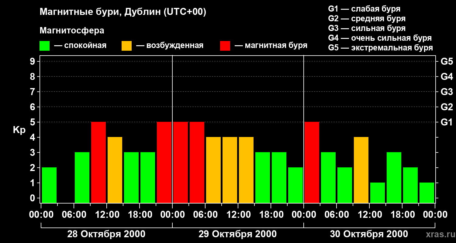 Изменения геомагнитного индекса Kp с 28 по 30 октября 2000 года для средних широт