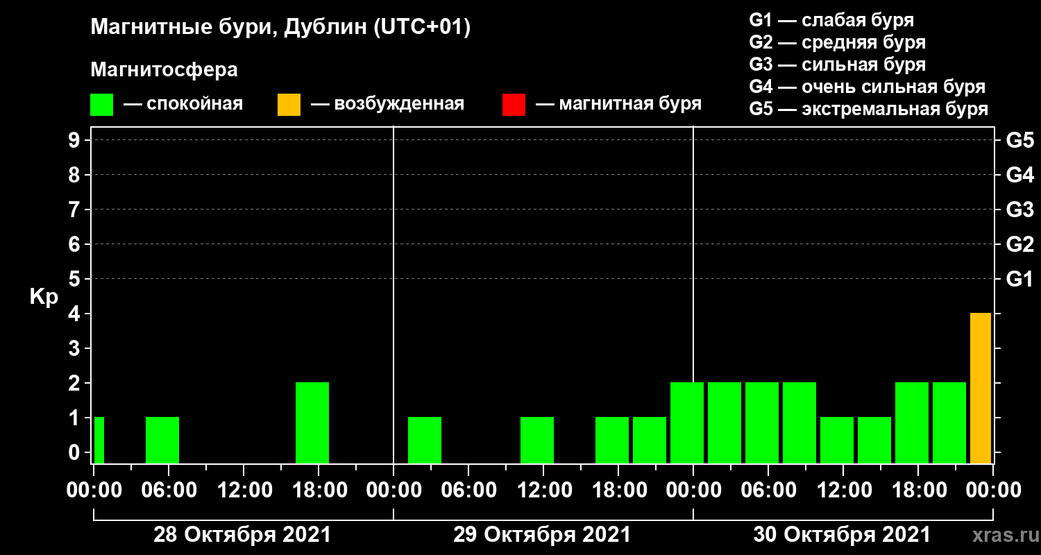 Изменения геомагнитного индекса Kp с 28 по 30 октября 2021 года для средних широт