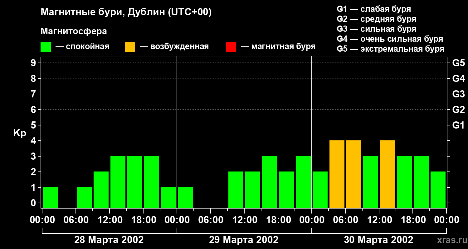 Изменения геомагнитного индекса Kp с 28 по 30 марта 2002 года для средних широт