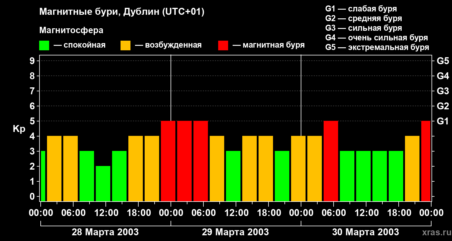 Изменения геомагнитного индекса Kp с 28 по 30 марта 2003 года для средних широт