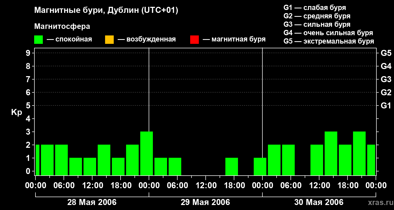Изменения геомагнитного индекса Kp с 28 по 30 мая 2006 года для средних широт