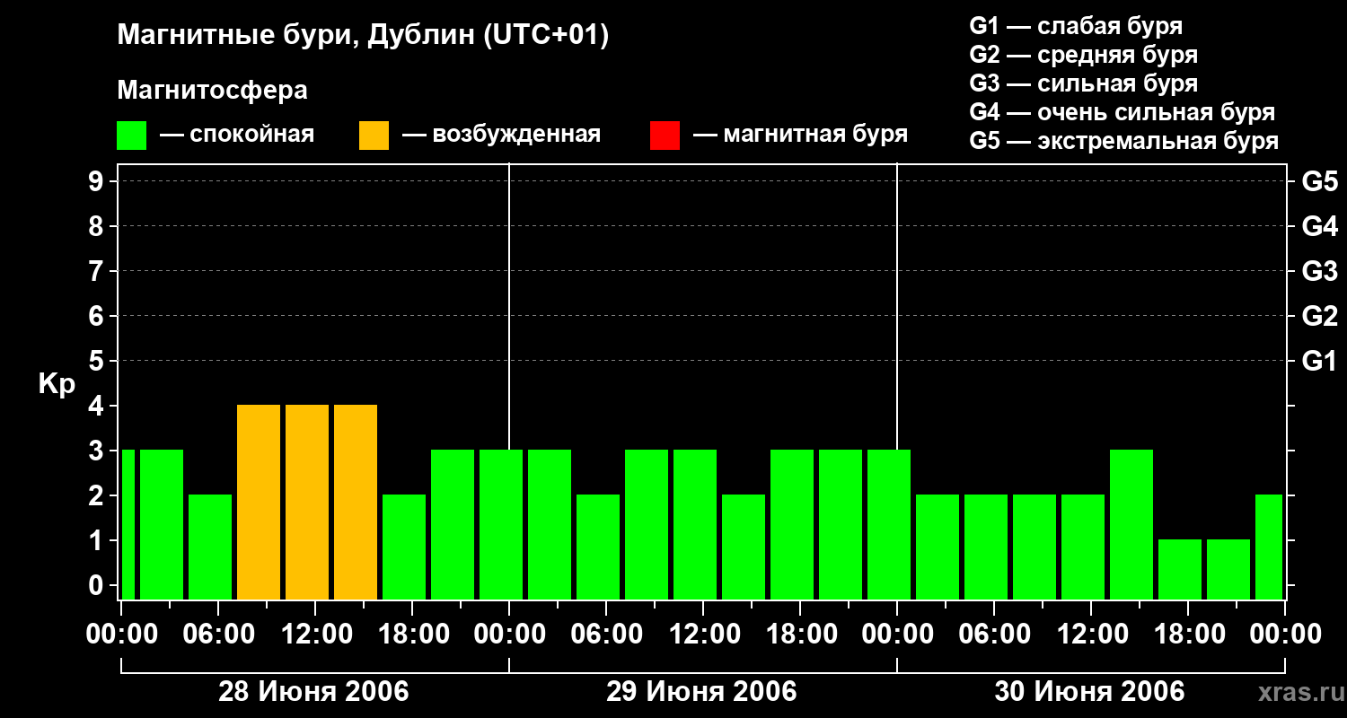 Изменения геомагнитного индекса Kp с 28 по 30 июня 2006 года для средних широт