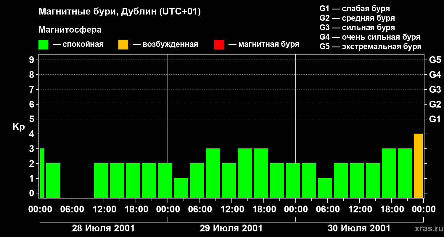 Изменения геомагнитного индекса Kp с 28 по 30 июля 2001 года для средних широт
