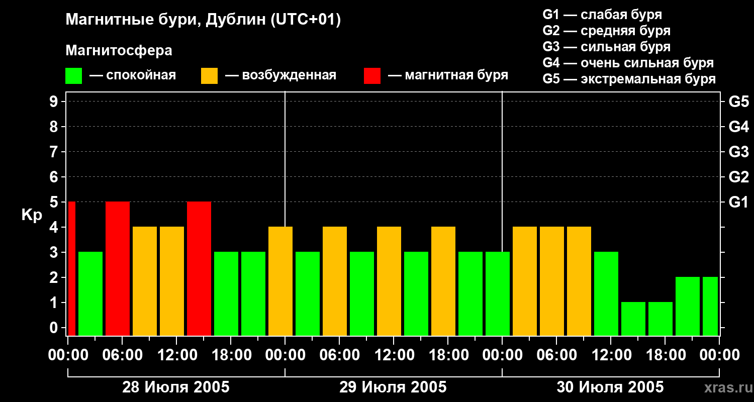 Изменения геомагнитного индекса Kp с 28 по 30 июля 2005 года для средних широт