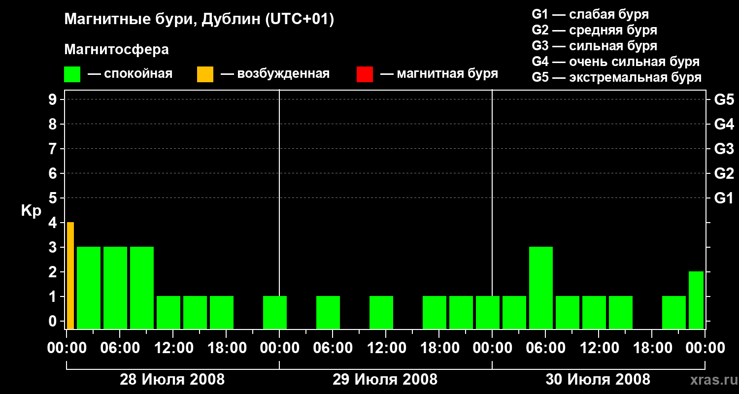 Изменения геомагнитного индекса Kp с 28 по 30 июля 2008 года для средних широт