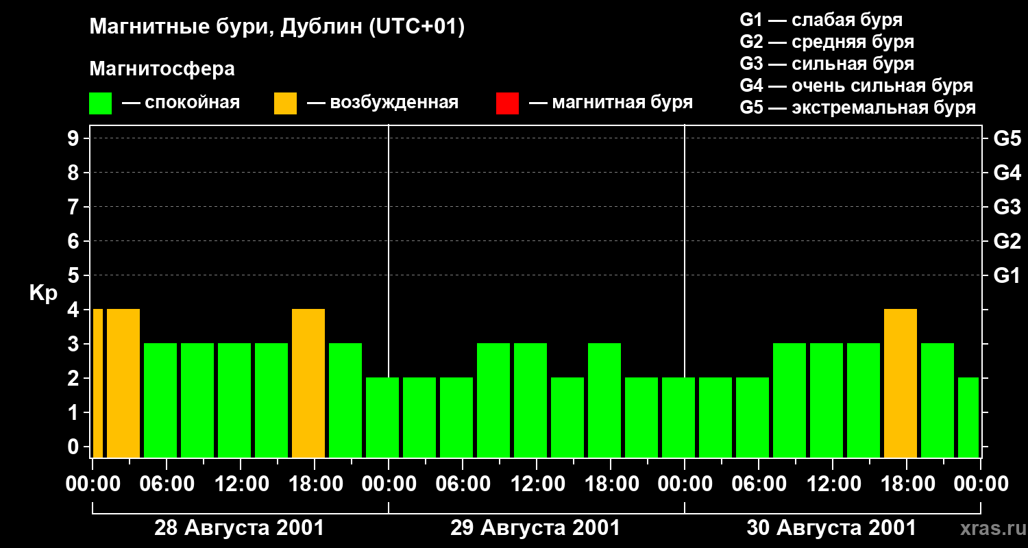 Изменения геомагнитного индекса Kp с 28 по 30 августа 2001 года для средних широт