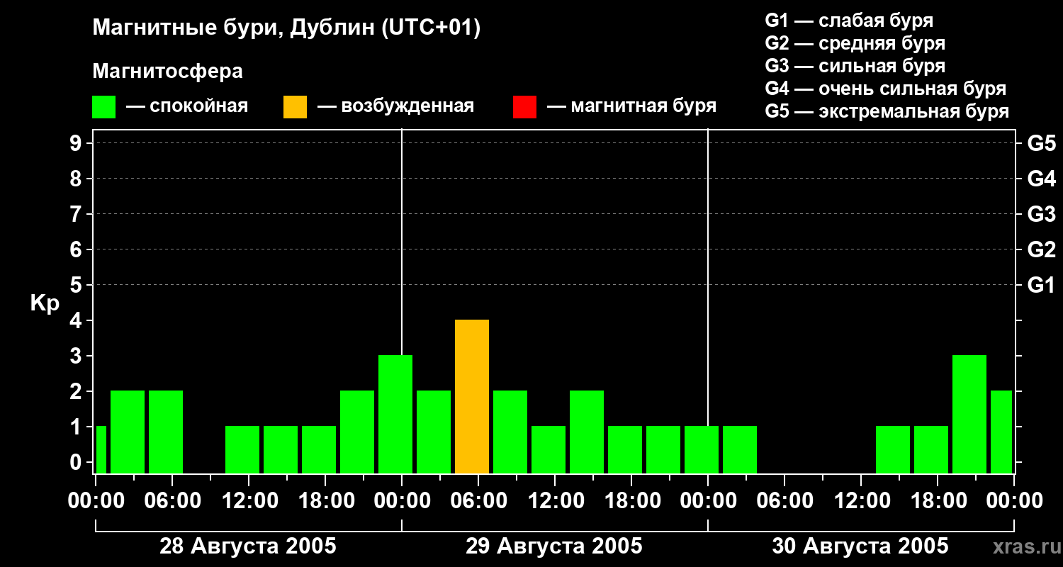 Изменения геомагнитного индекса Kp с 28 по 30 августа 2005 года для средних широт