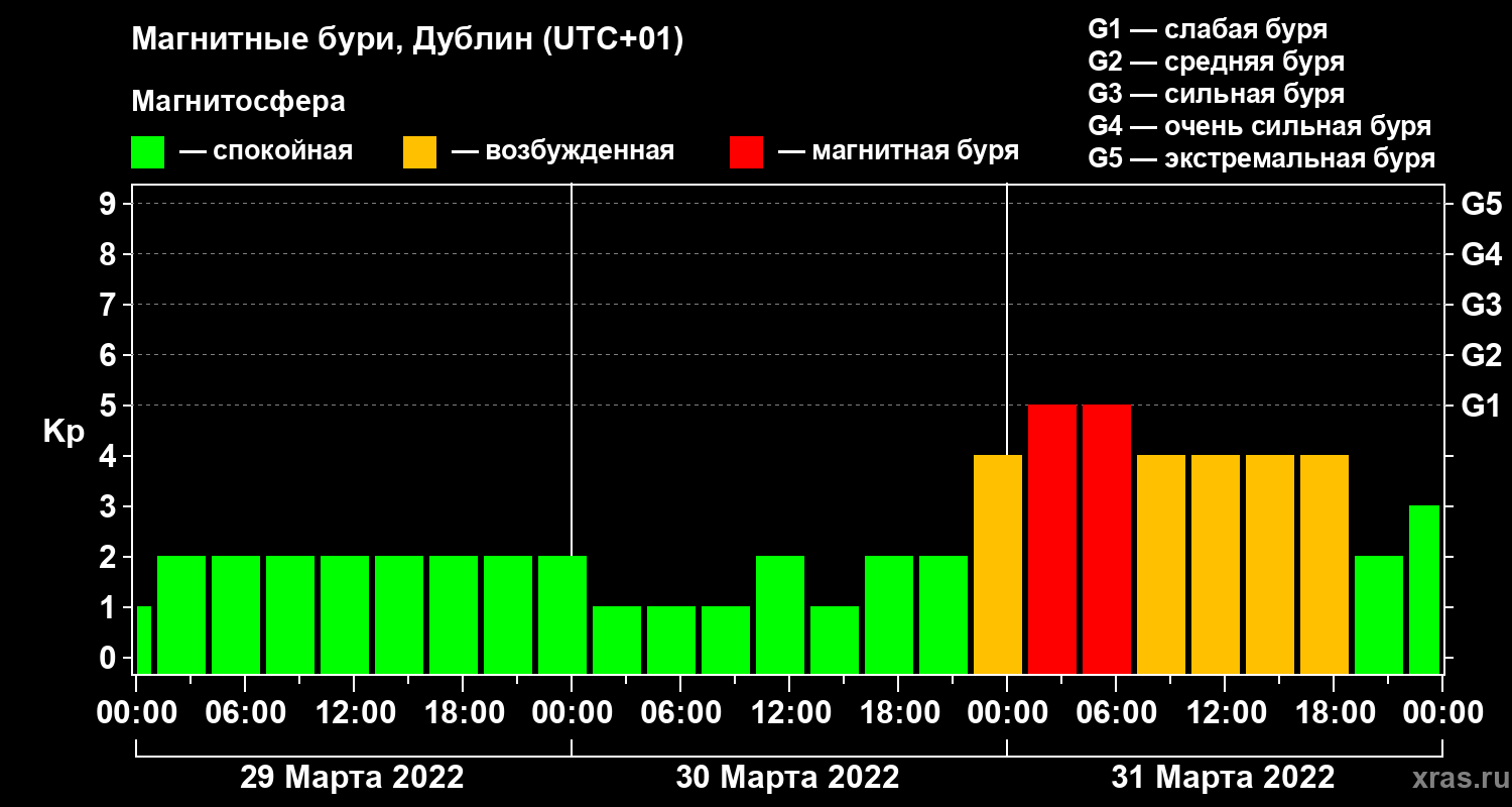 Изменения геомагнитного индекса Kp с 29 по 31 марта 2022 года для средних широт