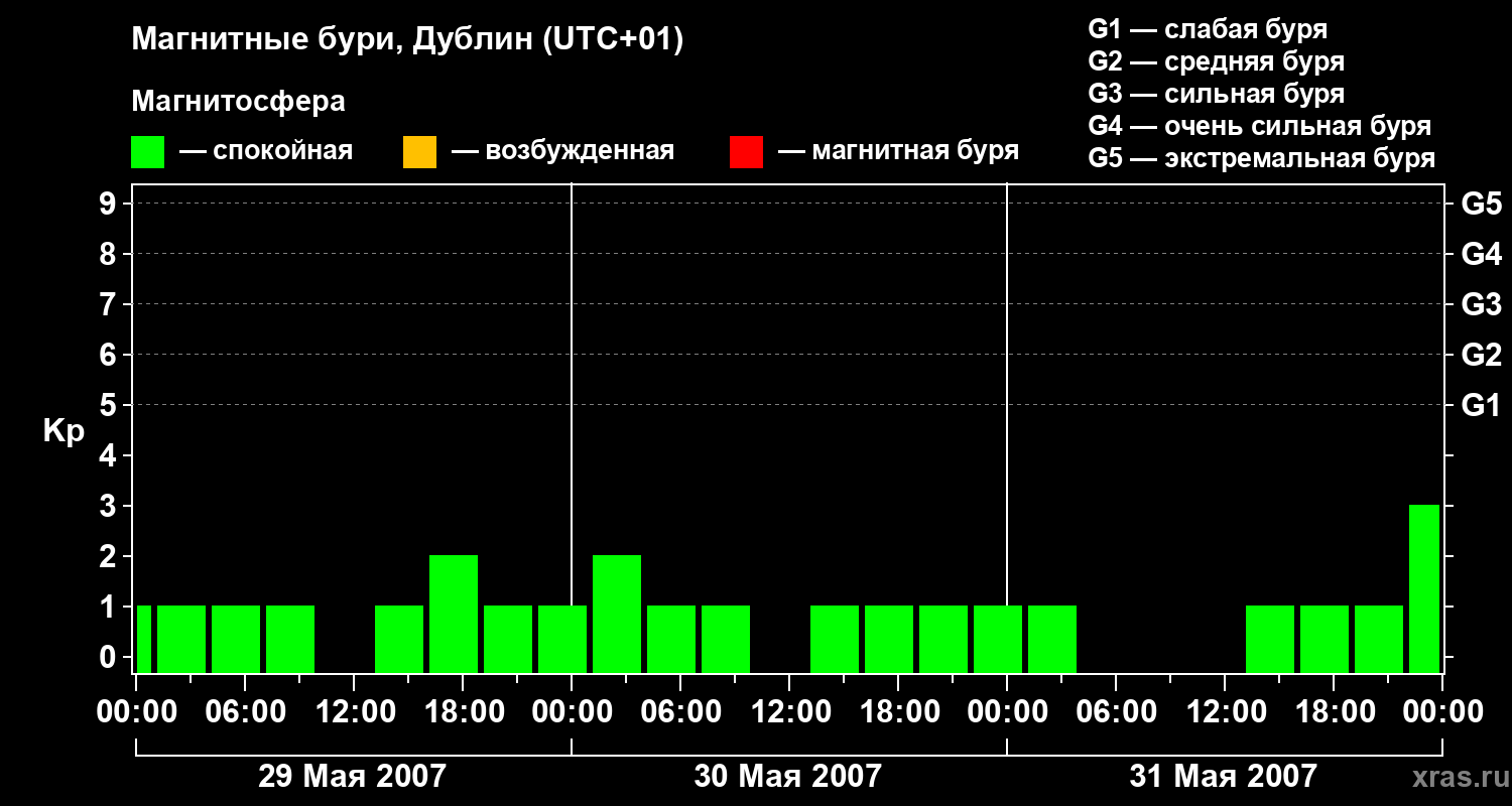 Изменения геомагнитного индекса Kp с 29 по 31 мая 2007 года для средних широт