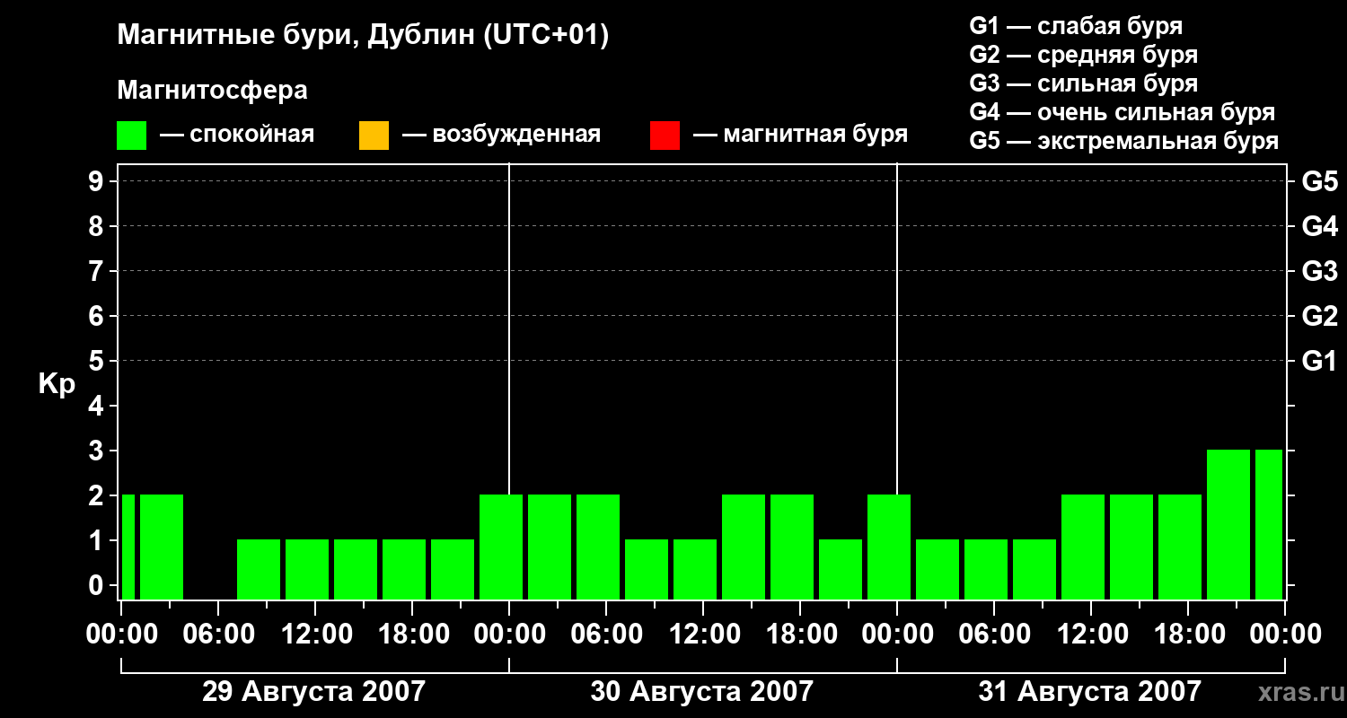 Изменения геомагнитного индекса Kp с 29 по 31 августа 2007 года для средних широт