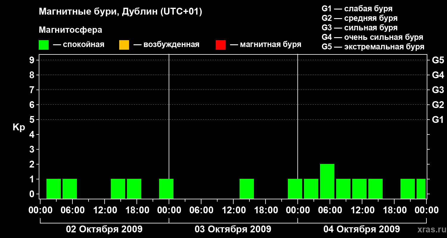 Изменения геомагнитного индекса Kp с 2 по 4 октября 2009 года для средних широт