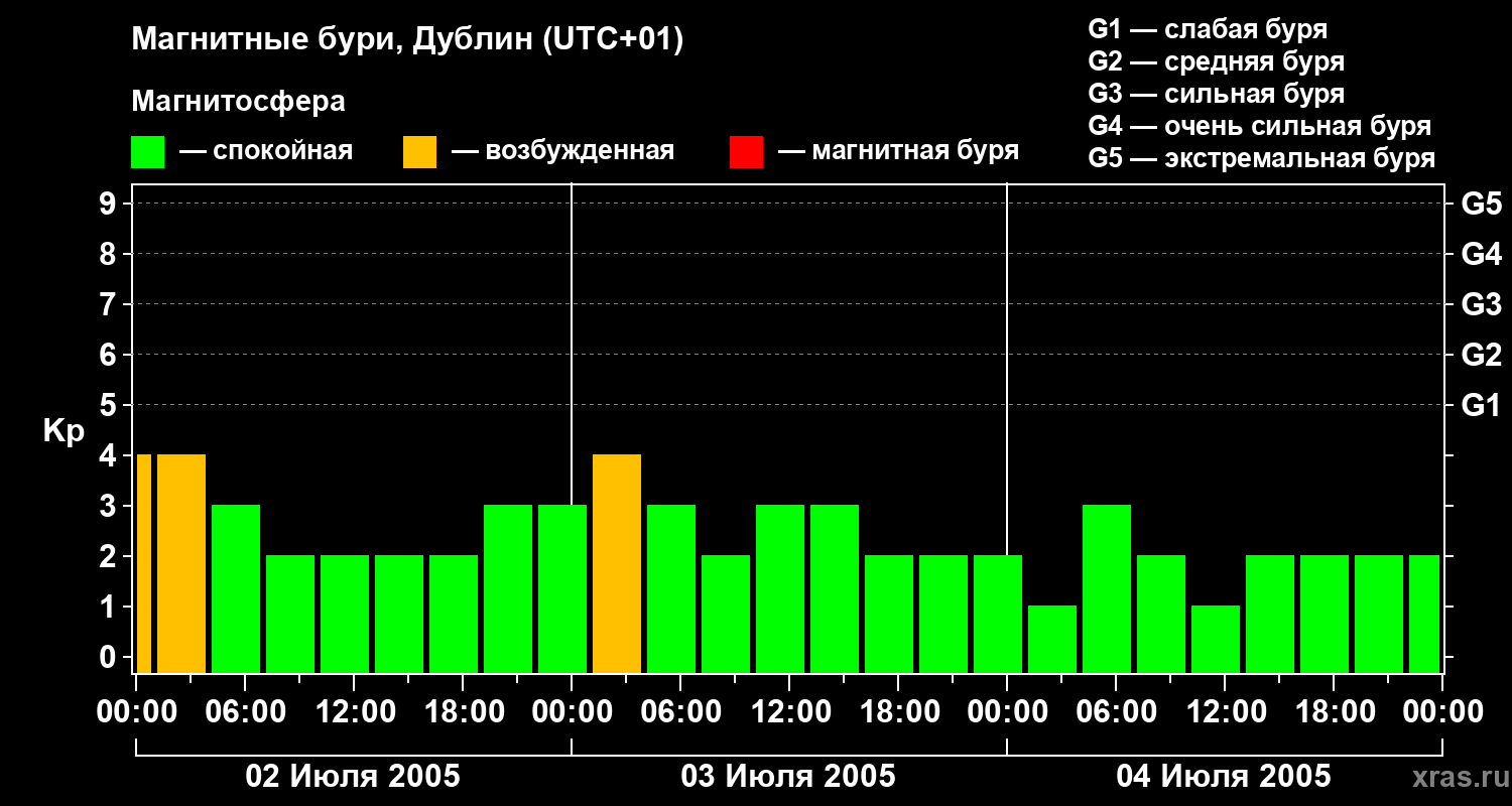 Изменения геомагнитного индекса Kp с 2 по 4 июля 2005 года для средних широт