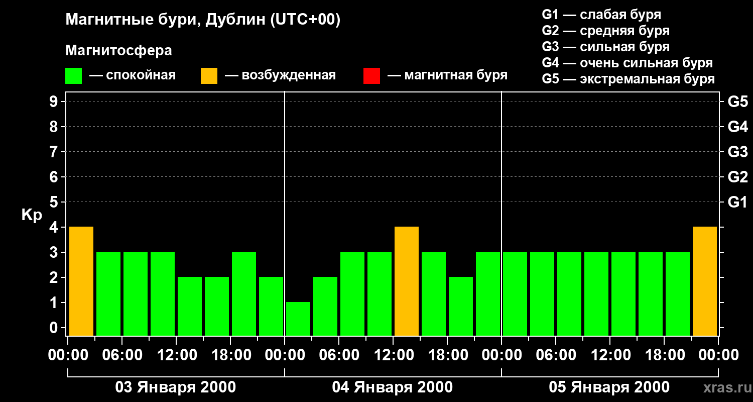 Изменения геомагнитного индекса Kp с 3 по 5 января 2000 года для средних широт
