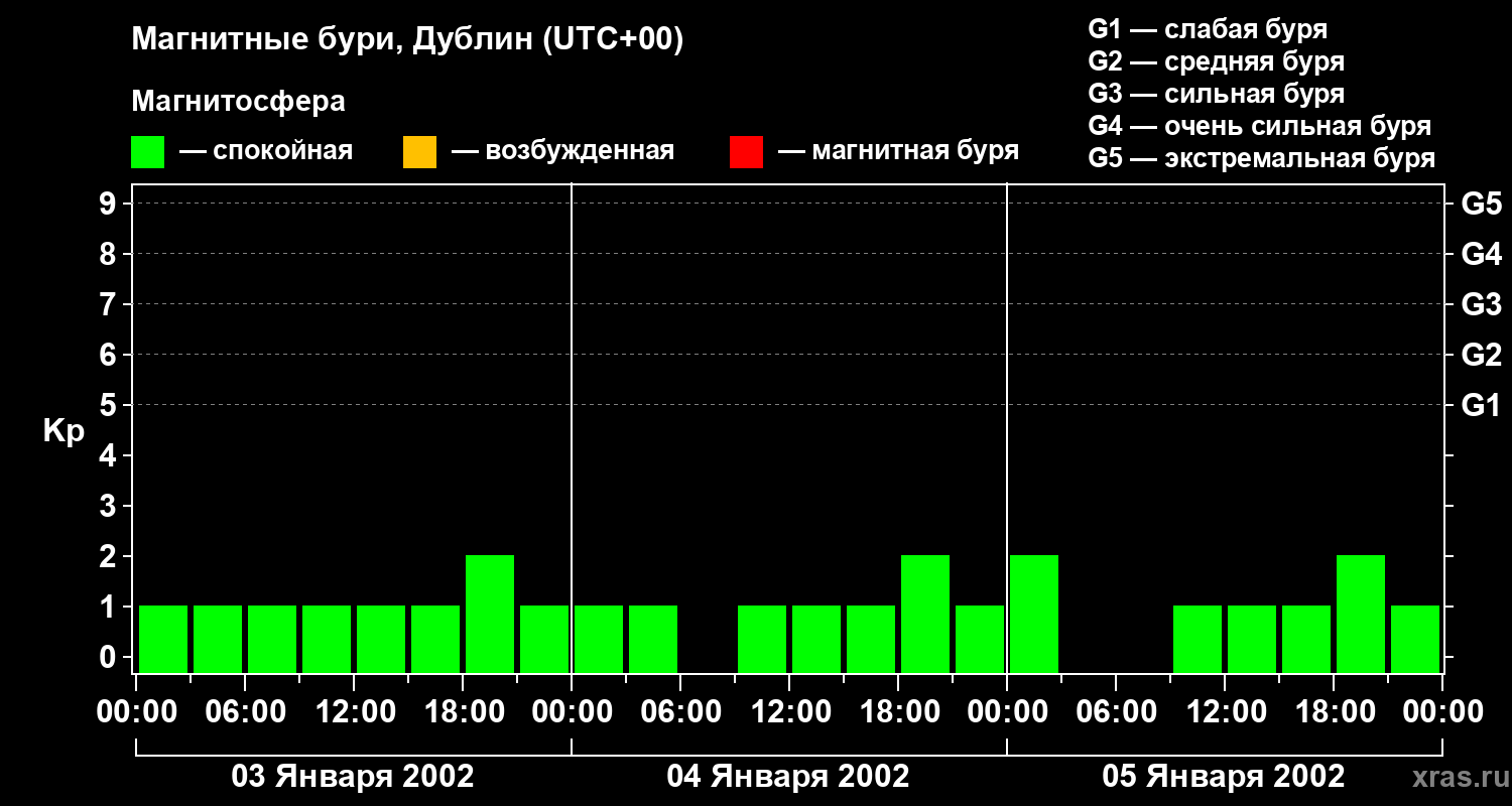 Изменения геомагнитного индекса Kp с 3 по 5 января 2002 года для средних широт