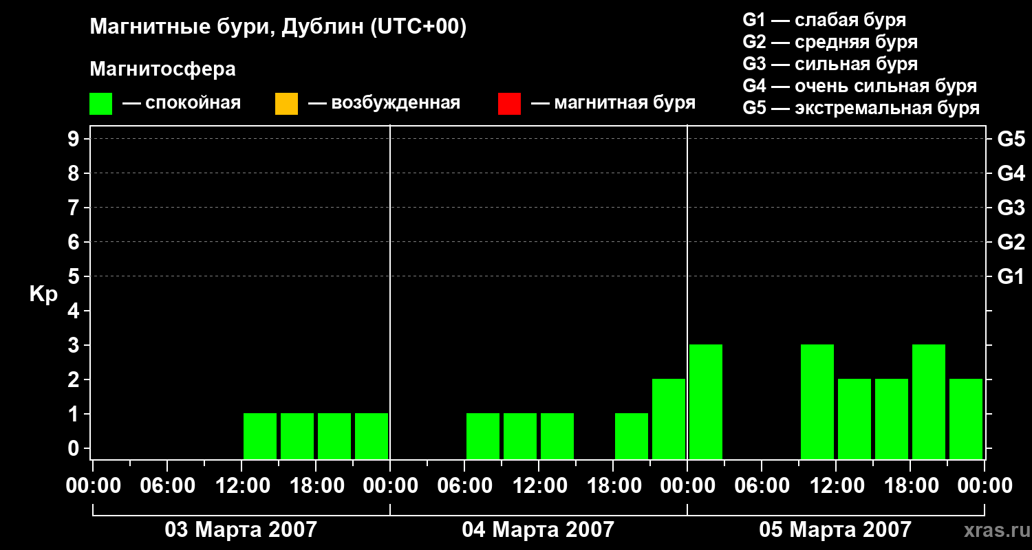 Изменения геомагнитного индекса Kp с 3 по 5 марта 2007 года для средних широт