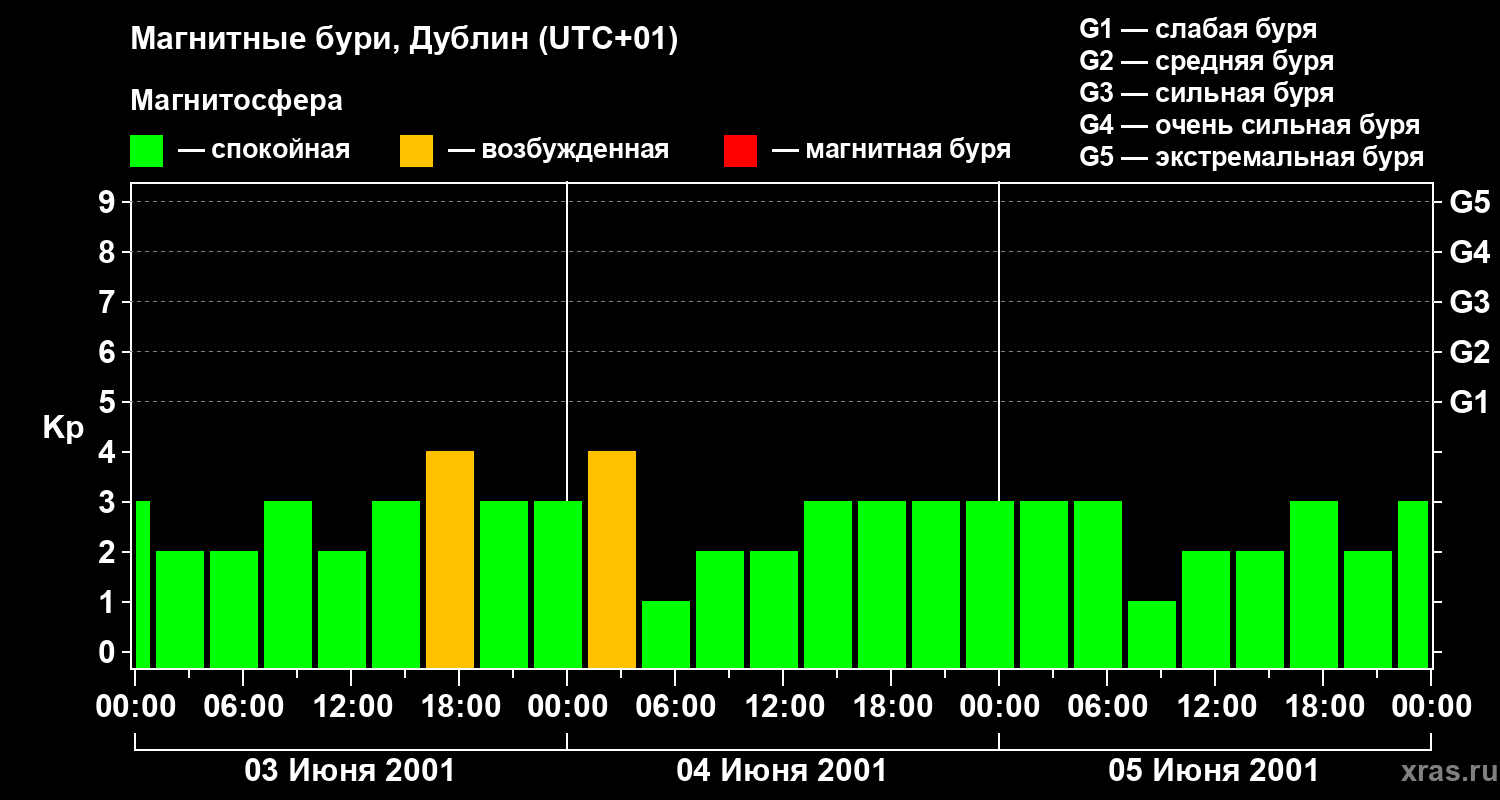 Изменения геомагнитного индекса Kp с 3 по 5 июня 2001 года для средних широт