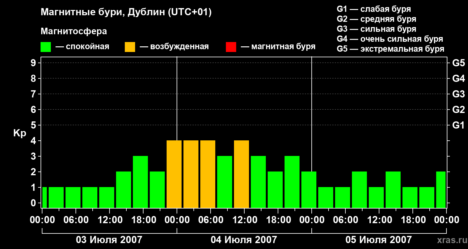 Изменения геомагнитного индекса Kp с 3 по 5 июля 2007 года для средних широт