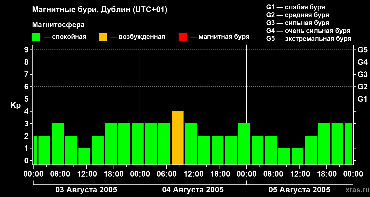 Изменения геомагнитного индекса Kp с 3 по 5 августа 2005 года для средних широт