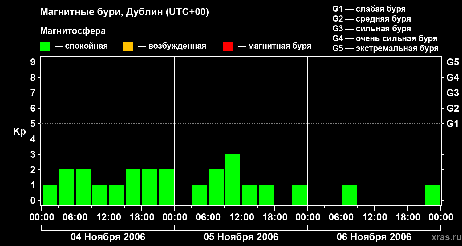 Изменения геомагнитного индекса Kp с 4 по 6 ноября 2006 года для средних широт