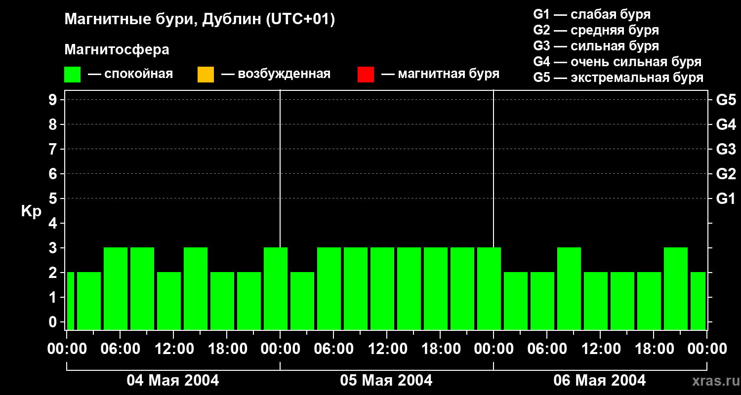 Изменения геомагнитного индекса Kp с 4 по 6 мая 2004 года для средних широт