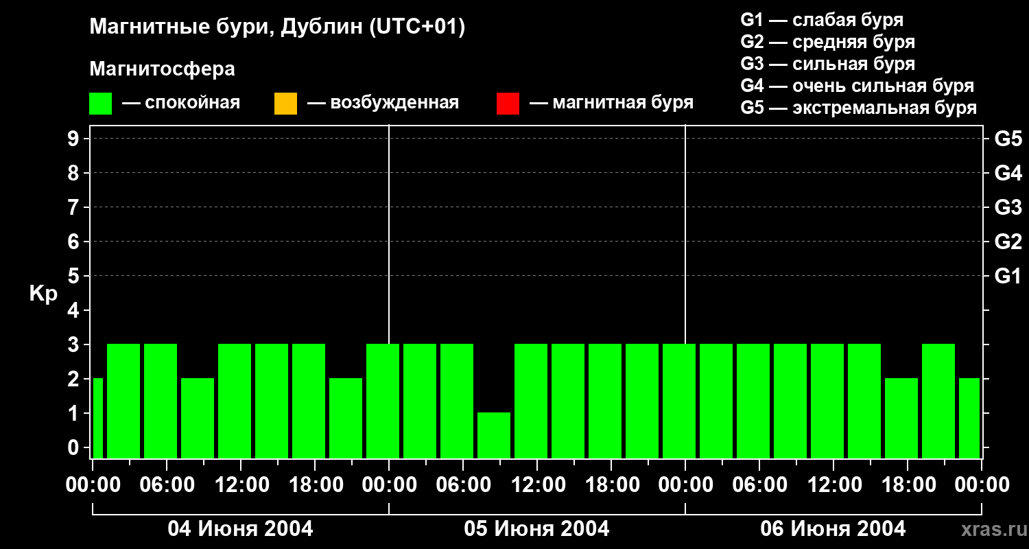 Изменения геомагнитного индекса Kp с 4 по 6 июня 2004 года для средних широт