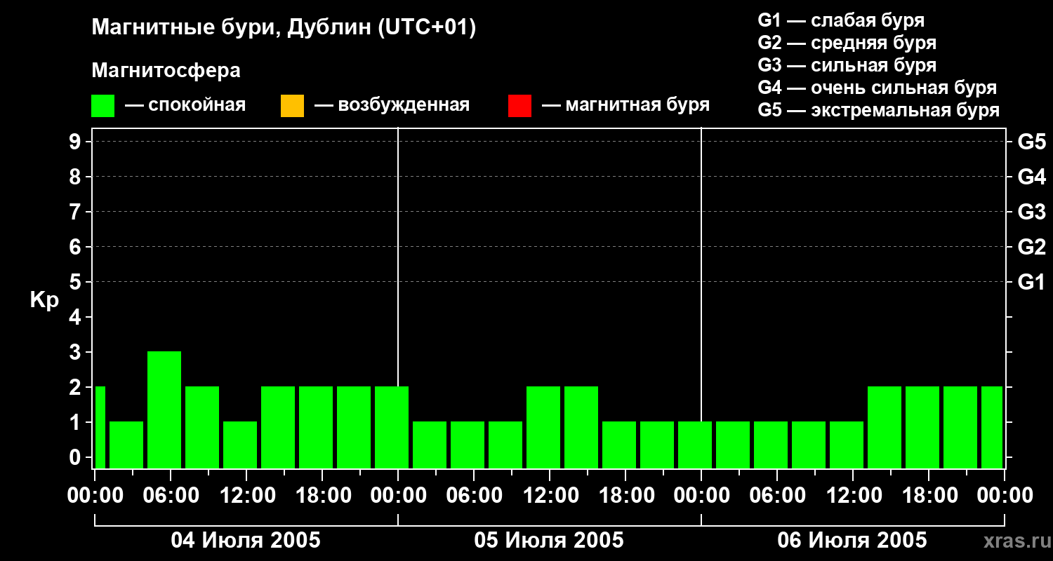 Изменения геомагнитного индекса Kp с 4 по 6 июля 2005 года для средних широт